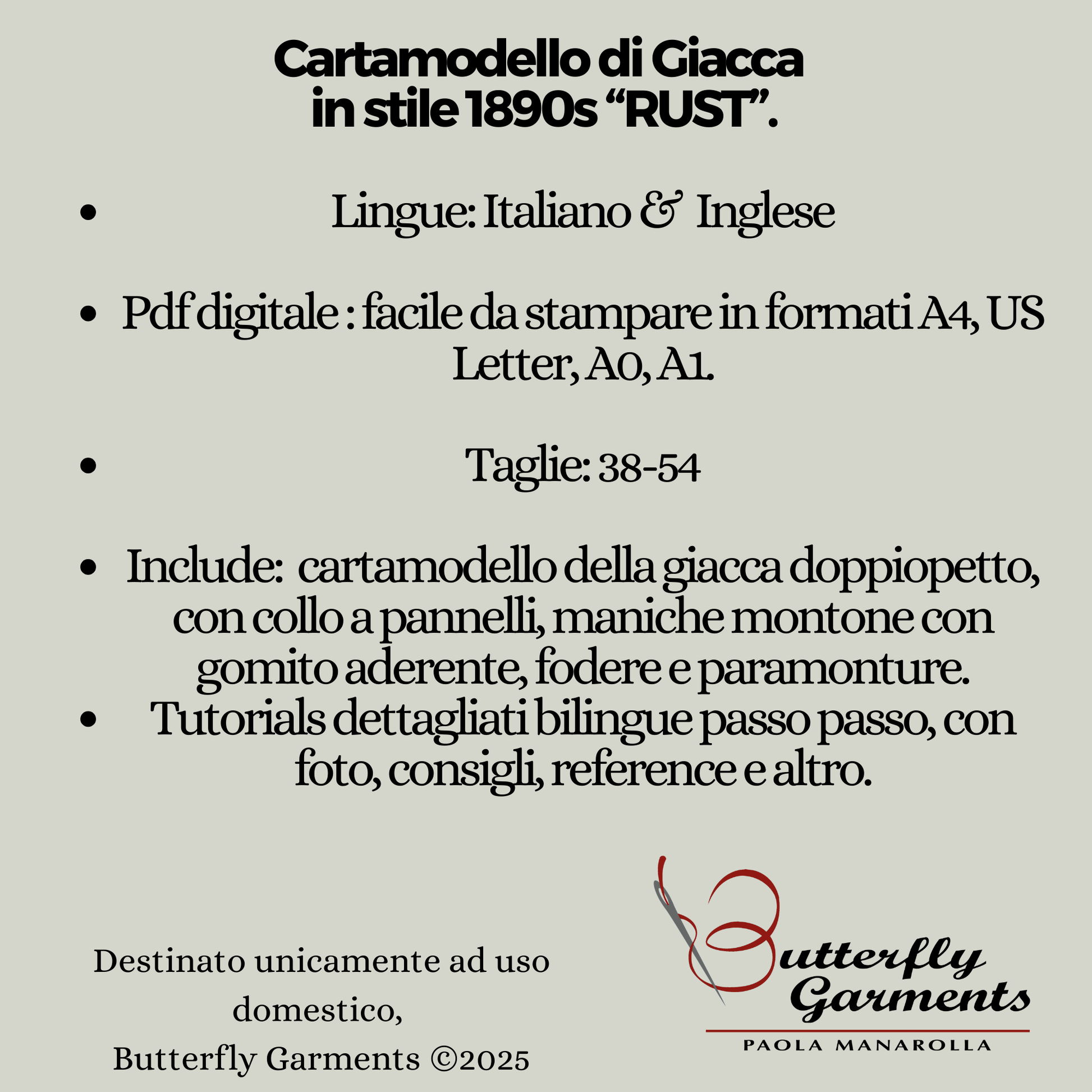 📋 Product Details: • Model name: Rust • Designer: Paola Manarolla, Butterfly Garments • Sizes: 38 to 54 (standard Europen sizing) • Difficulty: 4/5 • Print Formats: A4, US Letter, A0, A1 •Languages: English, Italiano • Usage: Domestic use only.