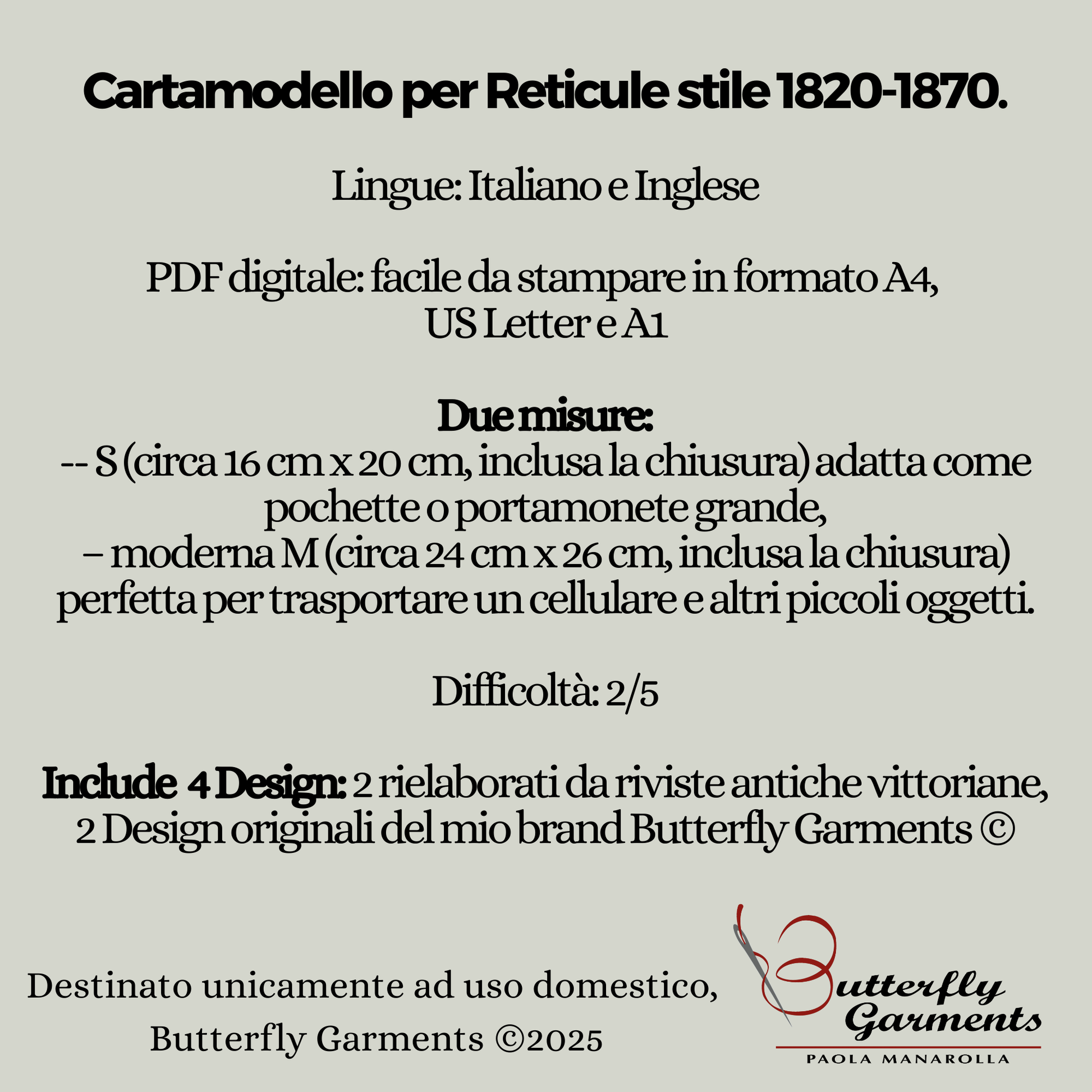 📦 What's Included: • Digital patterns for reticule in two sizes (S: 16x20cm, M: 24x26cm including "clasp" height) in PDF format • Complete tutorial with materials list and historical references • 4 different soutache cord designs (2 from Victorian magazines, 2 Original designs copiright Butterfly Garments) • Step-by-step photo instructions with detailed text • Print guide with preview formats