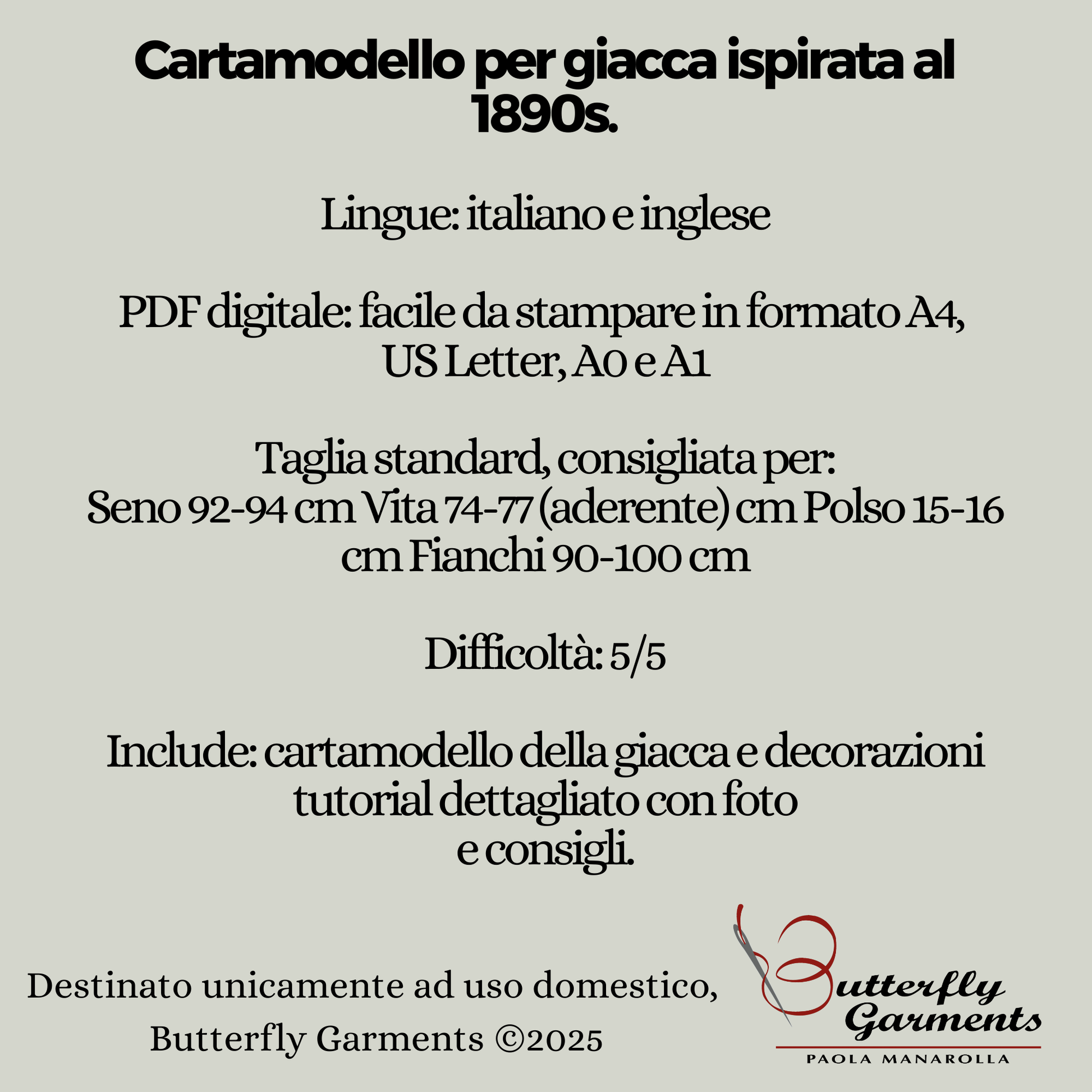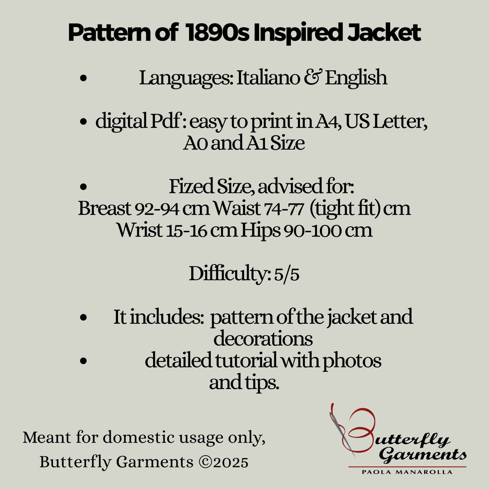 Model name: MINT • Size: Based on my personal measurements (Fixed size, Advised for Breast 92-94 cm Waist 74-77 cm Wrist 15-16 cm Hips 90-100 cm ) • Era: 1890s-1900 late Victorian • Skill Level: Advanced+, 5+/5 •Format: Digital PDF download. Pattern in A4, US Letter, A0, A1. • Designer: Paola Manarolla, Butterfly Garment • Usage: Domestic use only.